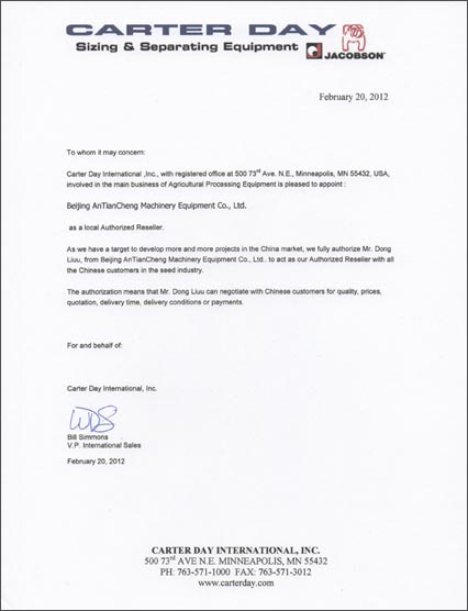 Carter Day公司充分授權(quán)北京安田成機械設(shè)備有限公司的劉東先生,在中國種業(yè)作為Carter Day公司的授權(quán)經(jīng)銷商。作為中國種業(yè)的授權(quán)經(jīng)銷商,我們有一個共同的目標就是開發(fā)更多的項目在中國市場,對于CarterDay公司旗下所有產(chǎn)品,劉東先生代表Carter Day公司可以與中國客戶有權(quán)進行質(zhì)量交涉、價格、報價、交付時間、交付或付款等等事項。