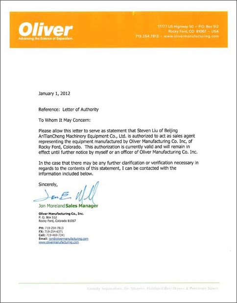 此授權(quán)書特此聲明來自北京安田成機械設(shè)備有限公司的劉東先生被我公司授權(quán)作為一級銷售代理商,代理銷售Oliver制造有限公司旗下所有產(chǎn)品,此授權(quán)書自發(fā)布之日起,將一直有效,直到Oliver制造有限公司發(fā)出新的聲明。
